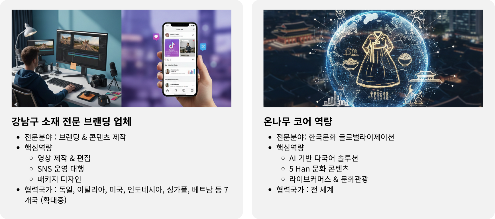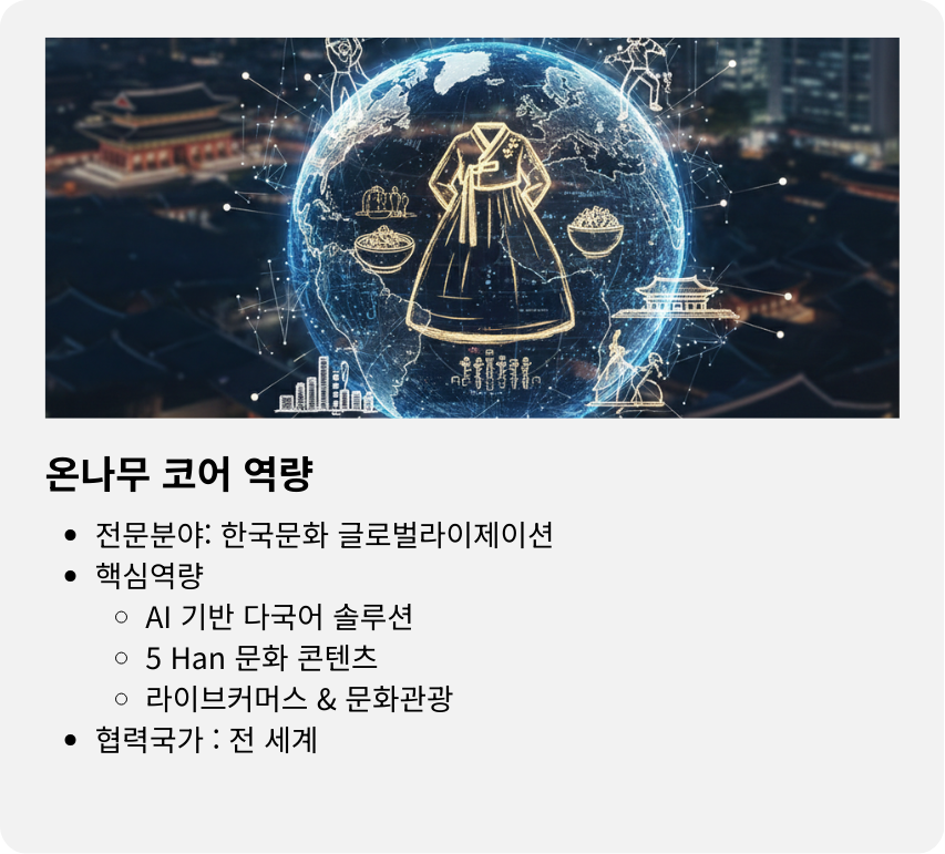 온나무는 전 세계 네트워크로 연결된 크리에이터와 드리머들과 함께브랜드의 정체성을 설계하고, 콘텐츠로 확장하며, 채널 운영까지 책임지는 토탈 브랜딩 서비스를 제공합니다.
